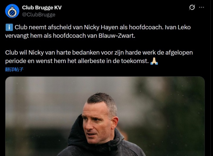布鲁日官方写道:“布鲁日俱乐部宣布尼基·海恩卸任主教练一职,伊万·莱科将接替他担任主教练。”